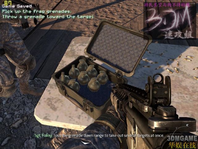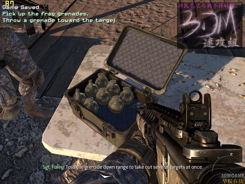 射完之后(想歪了自重)到身后拿手雷,走过去自动捡起来,然后对着靶场那一群靶子中间扔一颗,不爽的话多扔几颗也无妨,不要像着队友扔就好,当然也不要往自己脚底下扔。