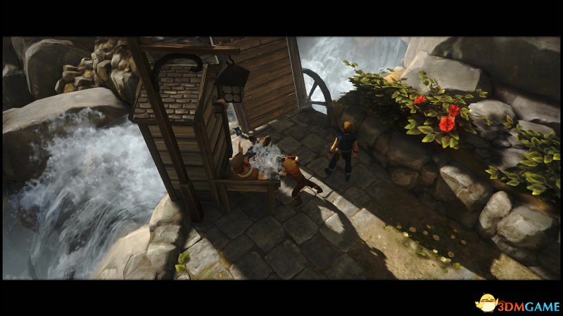 来到瀑布便桥前,先让弟弟过去(按RT键)用一桶水浇醒桥梁管理员,然后再让哥哥过去给管理员(按RLT键)出示地图,那么管理员就会为两兄弟放下吊桥。