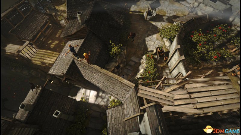 step4.来到村子前,那嗰顽皮的小孩把大门给关上了,那么两兄弟唯有通过村子旁边的岩壁翻进村子,两兄弟靠近岩壁底部两块大石(按LT、RT键)攀扶上去,然后(左摇杆↑、右摇杆↑)抬头往上看,(松开LT、RT键)往上跳然后在马上(按LT、RT键)抓住中层的大石,如是而已爬上小山头。兄弟俩继续(按LT、RT键)攀附着小山上的城墙边缘爬进小镇,然后往露台右侧的大鼓翻过一堵墙,接着两兄弟一起爬上壹段省网来到屋顶,从屋顶落到猪棚。