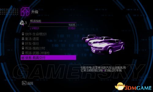 这是群体技能,可以增加黑道圣徒团队里所有伙伴的生命值以及能力。其中载具交付可以储存被储存的车辆,在用N扫描过的车辆,就可以无限的被使用。利用电话就可以从你的车库里把这调用出来。