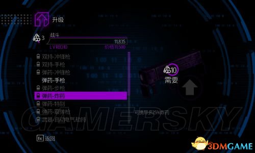 这里的战斗指的是在战斗中的能力提升,里面包括“双持”、“弹药”、“武器”、“近战”三种,其中双持可以增加攻击效率、攻击力增加一倍;弹药可以提高子弹的携带量;“武器”是可以升级武器库中的装备,在武器库的通道里,可以新的武器。
