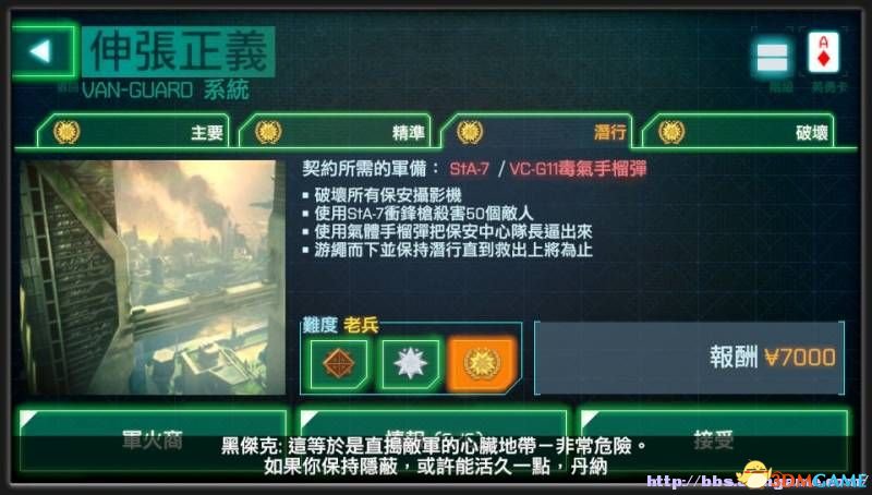 转完气阀之后安全中心上面的通风口就会打开,换上毒气弹往通风口那里扔,队长就会开门跑出来。上去从背后进行审问,没把握的可以在扔毒气弹之前去边上的BLACKJACK箱子装备麻醉枪,然后朝队长射击,再进行审问。