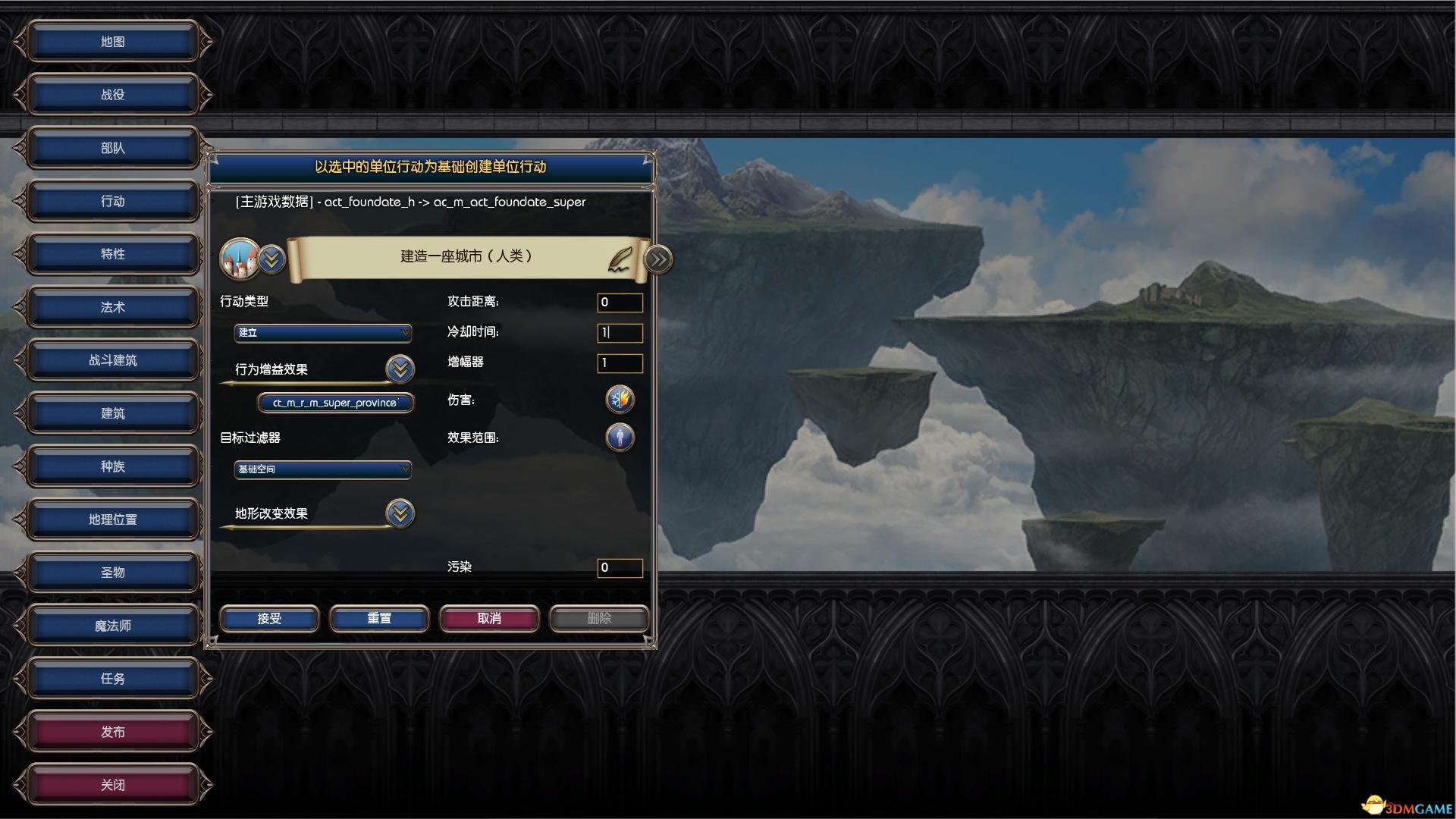 1.选择行动,在最后一页找到创建一座城市(人类),单击,新建名称自己起,单击行为增益效果下拉箭头,选择第一项,注意super就是你新建种族的城市,冷却选择1,否则会提示有问题。最好将名称改为建造一座城市(super)。