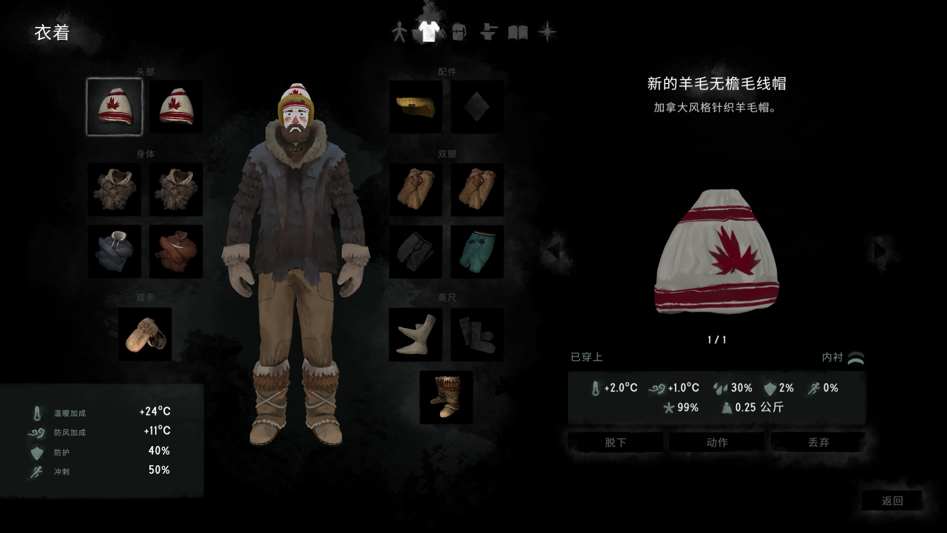 3、衣物类:熊皮大衣X1,羊毛帽X2,耳套X1,狼皮大衣X2,连帽衫X1,薄羊毛衫X1,兔皮手套X1,鹿皮裤子X2,保暖裤X1,羊毛短袜X1,鹿皮鞋子X1。