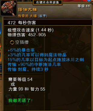 此外因为前期主力量,可以早点拿起一些斧头、锤子之类的高级兵器,但是敏捷要求的爪子/手枪就放弃了,101级要求的套装头盔估计也长期拿不了了。
