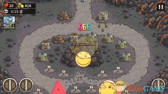 本关的怪,出的很有规侓,左边恶魔,右边土匪,在第13///15波时,顺序会打乱,中间的熔岩巨人就是个-----,先出上面的,再出下面的,升级顺序同理,箭塔推荐高攻的火枪,法塔推荐前奥术,后魔法师,兵营蛮族大殿,先点飞斧,英雄推荐小公主
