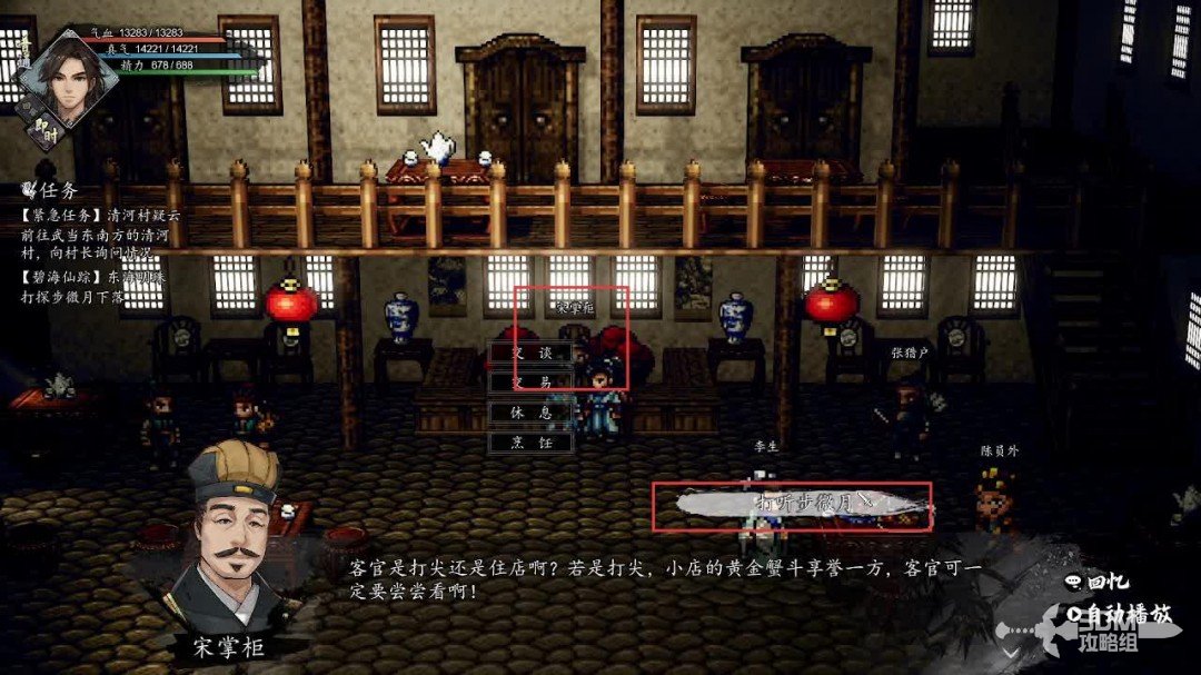 然后去到最右边的渡口打听,在掌柜那里购买黄金蟹斗就可以知道下一个线索。