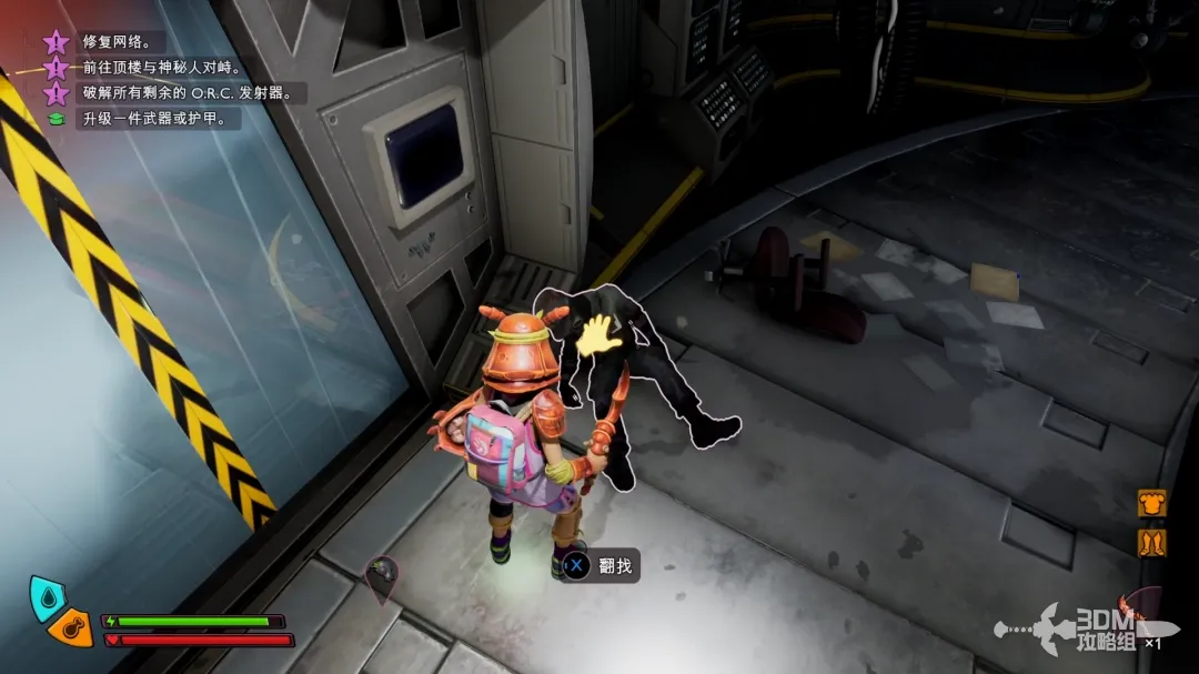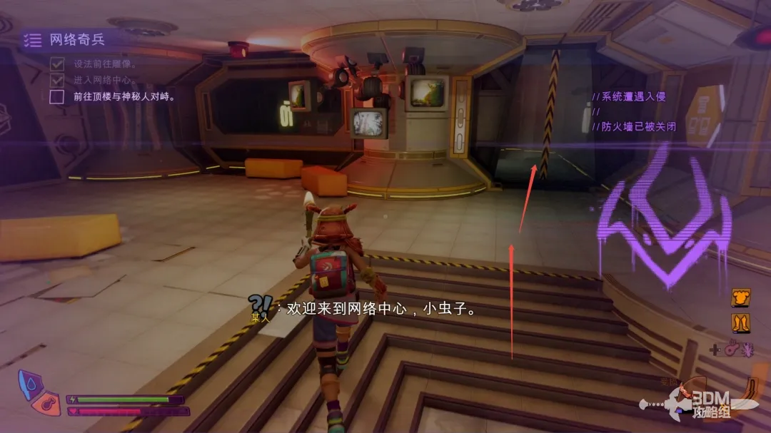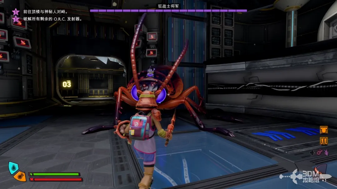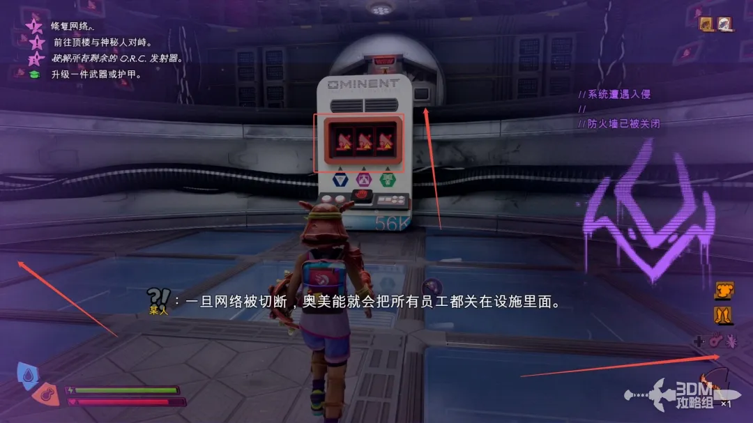 击败狂战将军蟑螂后,两侧就会升起一个斜坡,正中间的机器有个按钮,不过要先修复网络将三盏灯都变绿才能使用。