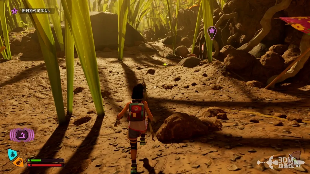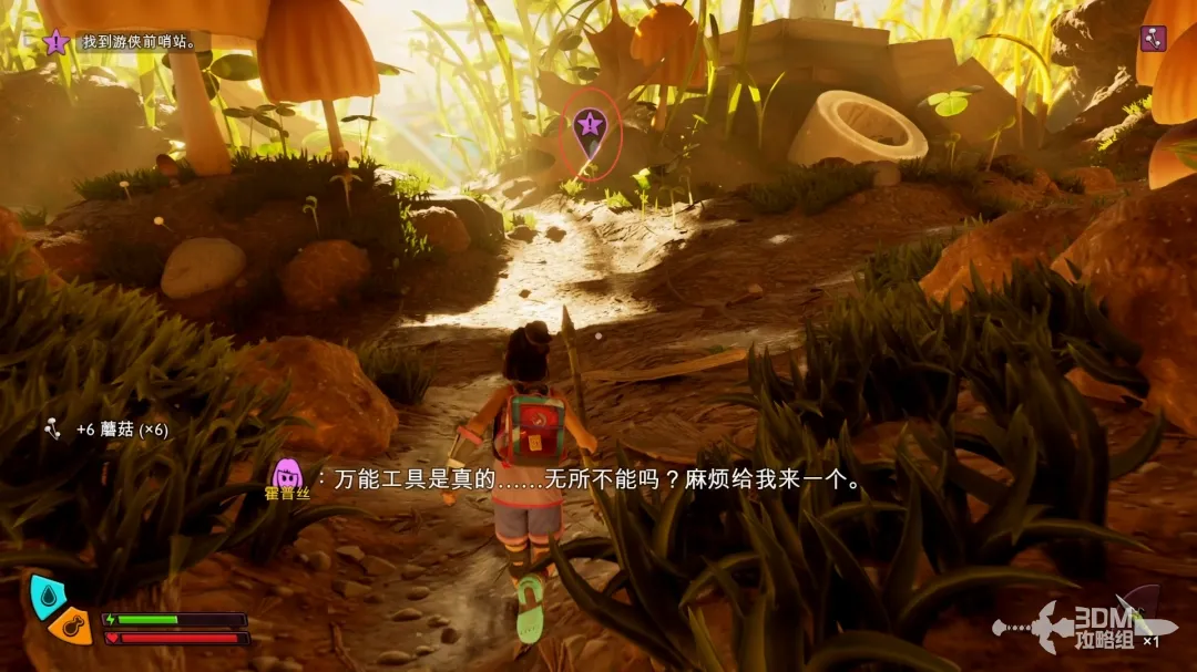 根据任务提示标记点,赶往下一目标点“游侠前哨站”路上的一些石头啊,纤维啊什么的基础材料顺手捡一些。