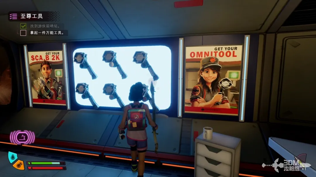 进入游侠前哨站,墙上有万能工具;拿一个万能工具就能够解锁斧头、铲子、锤子、扳手等功能;