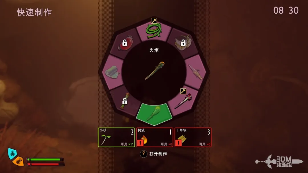 制作火炬需要小枝、树液和干草块,一会儿去探索时需要用到。
