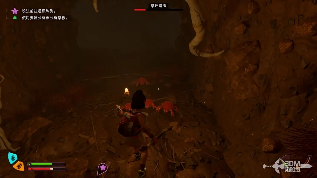 这个洞里面有很多的草坪螨虫,如果受伤了,使用之前在游侠前哨站拾取到的纤维绷带;需要注意使用绷带后如果再受到伤害,绷带将会失去恢复效果。之前忘记拾取制作纤维绷带也只需要一个纤维和一个树液。