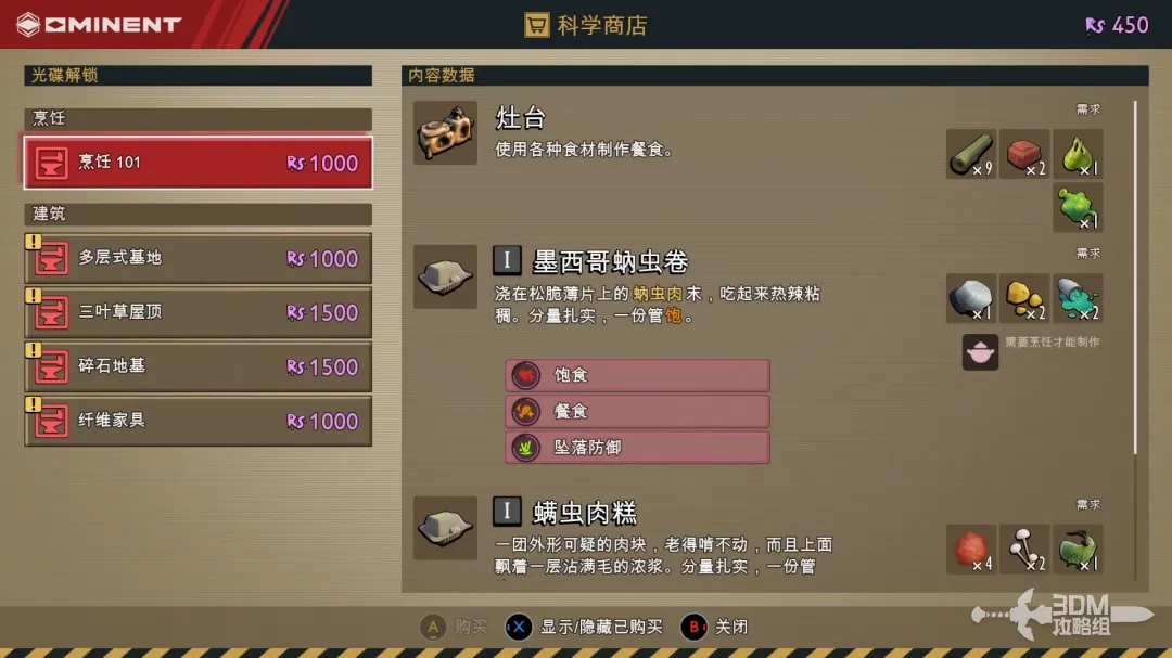之前分析新物资获得的脑力点数可以在科学商店内购买新的配方,解锁新的道具;