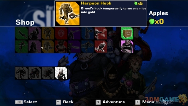每个关卡获得的道具主要为绿色和红色的苹果。红色苹果为角色补血,而绿色则是类似于金币的购买类道具,每个关卡通关之后获得的绿苹果,可以在商店购买增加人物角色和特殊模块的商品