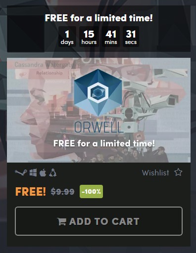 大家目前可以在Humble Bundle免费领取反乌托邦游戏《奥威尔:老大哥在看着你》(Orwell)的Steam激活Key,Steam原价37元,好评率92%。活动持续2天,目前还剩1天16小时。