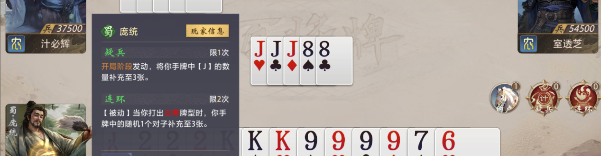又因为牌权可以通过抢地主来获得,这让我盯上了那些能开局提供固定资源的角色。比如现代汉语的受害者——庞统,他的一技能可以在开局就将玩家手中的J直接补充到三张,不需要运气与钓鱼。二技能又能在玩家打出三带牌型时,为任意对子补充一张,可控又实现了自循环。